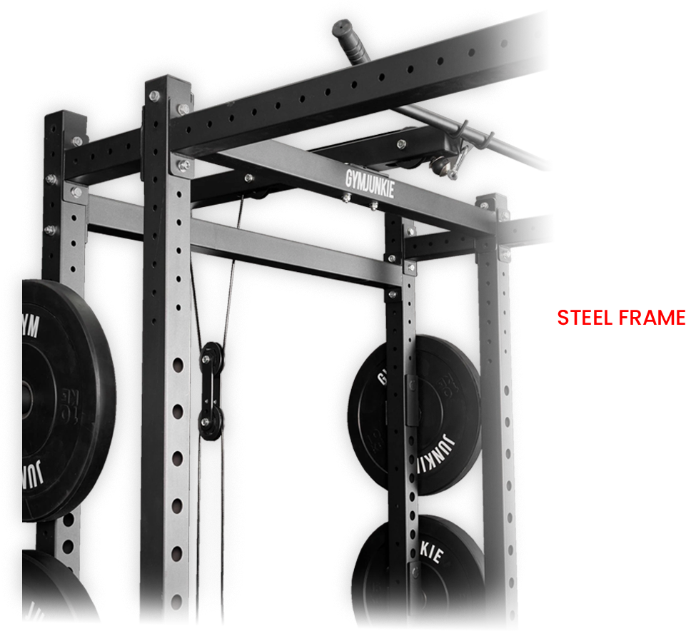 POWER RACKThis Gym Junkie Power Rack offers an incredibly heavy-duty steel frame and supports up to 350kg. We’ve added bonus extension kit which seamlessly expands the rear of your power rack, providing an optimal space for weight plates and a variety of additional attachments. The rack also includes the cable extension attachment which allows you to increase the range of workout you can achieve.